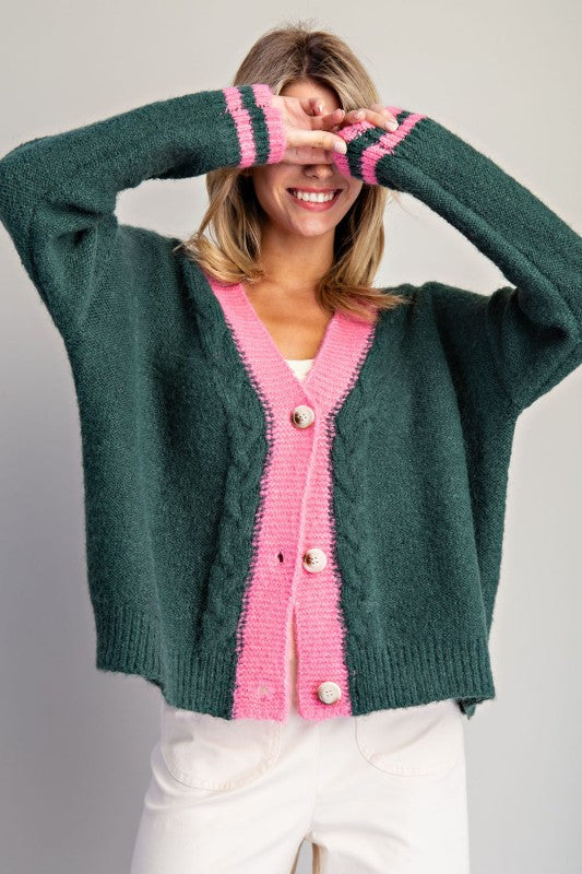 Contrast button down varsity cardigan + deep V-neckline framed in chunky ribbed trim + contrast pink placket and cuffs with striped detailing + dropped shoulders with subtle cable accents + button down front closure + ribbed hemline. Model is 5'8" and wearing a size small.